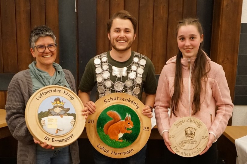 Mit einem 2,8 Teiler konnte sich erstmals Lukas Herrmann den Titel des Schützenkönigs 2025 sichern. Gefolgt wurde er von Wurstkönig Winfried Gegenbauer (4,1 Teiler) und Kornel Enderle (6,0 T.). Das beste Blattl bei der Luftpistole konnte Carmen Stahl mit einem herausragenden 1,8 Teiler vor Marc Stahl (6,7 T.) und Manuel Hudez (10,3 T.) erzielen. Jugendkönigin mit einem 7,0 Teiler wurde Dorothea Herb vor Barbara Herb (11,0) und Elias Spörl (11,1)
